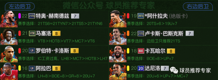 马塞洛是非常优秀的边后卫,虽然说攻大于守,但其实马塞洛防守也不差,身体也还算硬朗,最难能可贵的是马塞洛非常的灵活,可以说是极致的灵活,手感非常棒,转身什么都非常快,无论是进攻还是防守帮助都很大,回追速度也不错,综合来说是非常推荐的好用边后卫。赛季选择方面有条件直接VT金卡,平民的话银卡也是可以的,除此之外HOT和MC也是可供选择的。