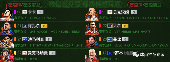 其余的菲戈、阿扎尔、迪马利亚都是非常优秀的橙级边锋,麦克马纳曼稍逊一筹,罗本目前没什么更好的赛季卡,比较遗憾。