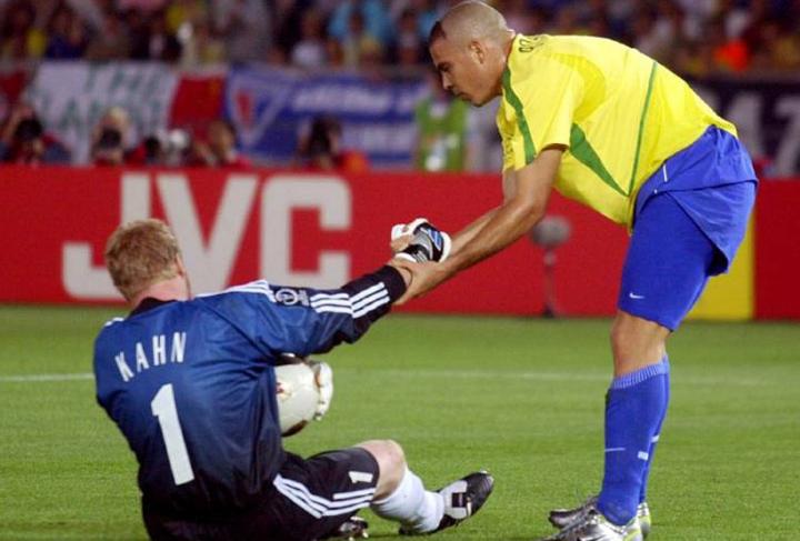 有的时候,你甚至感觉这场比赛就是属于卡恩和罗纳尔多之间的对决。尽管被德国的防守压得喘不过气,但在半场结束前罗纳尔多依然得到了一次和卡恩一对一的机会。这次卡恩用自己的右小腿挡出了罗纳尔多的左脚射门。看起来卡恩是如此稳固,不可动摇。但一个小时之后,卡恩却崩溃了。