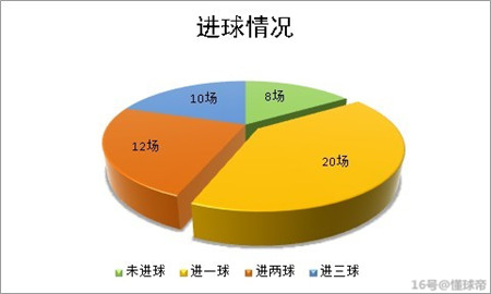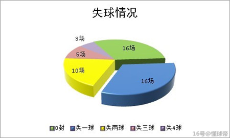 16次0封对手,16场比赛丢1球,10场丢2球,5场丢3球,3场丢4球。