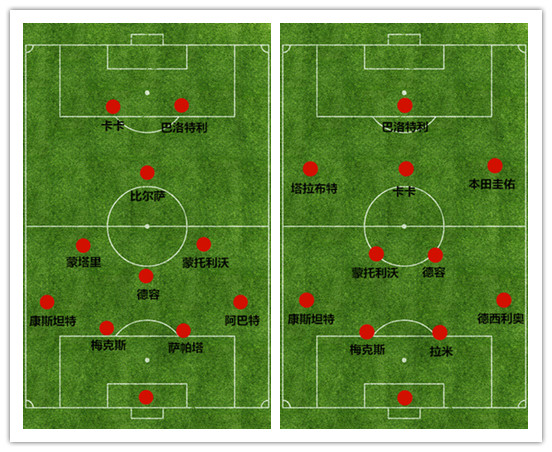从2013年9月18号欧冠主场对阵凯尔特人开始,也就是在对阵都灵使用4-3-2-1阵型后,囧叔又接连6场比赛使用调整后的4-3-1-2阵型,卡卡、比尔萨轮流出任前腰,罗比尼奥则作为前锋出场,同时协助中场组织以及边路策应,“重金”加盟的马特里得以出场,时而搭档巴洛特利,时而搭档罗比尼奥。马特里的出场使得巴洛特利经常离开禁区接球后,不至于出现这种情况: