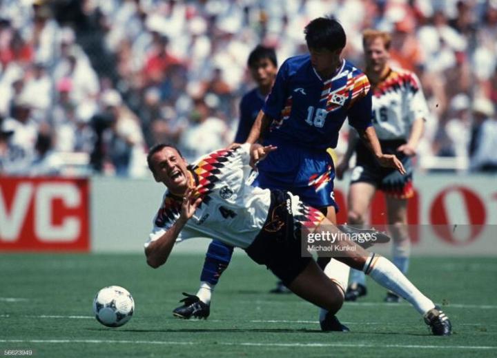 1994年世界杯,29岁的科勒正值职业生涯的巅峰,德国作为卫冕冠军被普遍看好,他们的小组赛对手也不算太强,首战顺利1比0击败玻利维亚。第二轮德国队和西班牙队1比1战平。本以为最后一轮面对韩国德国队可以实力碾压,比赛的上半场也确实是这样的剧本,德国队凭借克林斯曼的梅开二度和里德尔的补射取得三球领先。没想到韩国队在下半场仗着大热天和德国队拼命,发起绝地反击,弄的德国队和科勒尔狼狈不堪,虽然最终德国队3比2险胜,但老虎埃芬博格因为被换下后的对观众做出大胆手势被逐出国家队。