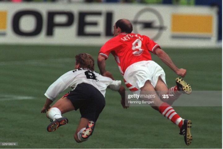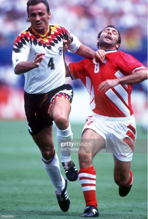 在进入十六强后,德国队遇上红魔比利时,那场比赛又是沃勒尔梅开二度,德国3比2取得胜利,但很明显,科勒尔领先的德国队后防线,已经不如四年前那么稳固。可能也是因为前面几支球队没有名气特别大的进攻球员,没有发挥出科勒尔盯人的特长。终于在四分之一决赛,保加利亚球王斯托伊奇科夫来了,这位当年在巴萨大杀四方的左脚将,算是和科勒尔势均力敌。那场比赛科勒也基本冻结了斯托伊奇科夫,没有让他发挥出突击的特点,但莱切科夫在禁区内以大欺小力压哈斯勒头球破门,此后霹雳火又用任意球破门绝杀了德国队。终场哨声响起,德国战车轰然倒地,属于那支黄金德国队的时代似乎已经一去不复返。