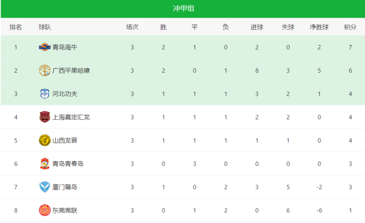 至此,本轮比赛全部结束。目前,积分榜上,领头羊青岛海牛积7分,刚遭遇首败的广西平果哈嘹积6分,位居次席;河北功夫凭借本轮掀翻广西军团的优异表现,升至第3名;同积4分的上海嘉定汇龙、山西龙晋分别排名第4、第5;青岛青春岛继续“平”稳开局,在收获3场0-0的平局之后,积3分的他们排名第6;刚获得首胜的厦门鹭岛则积3分,排名第7;升班马东莞莞联只积1分,排名垫底。