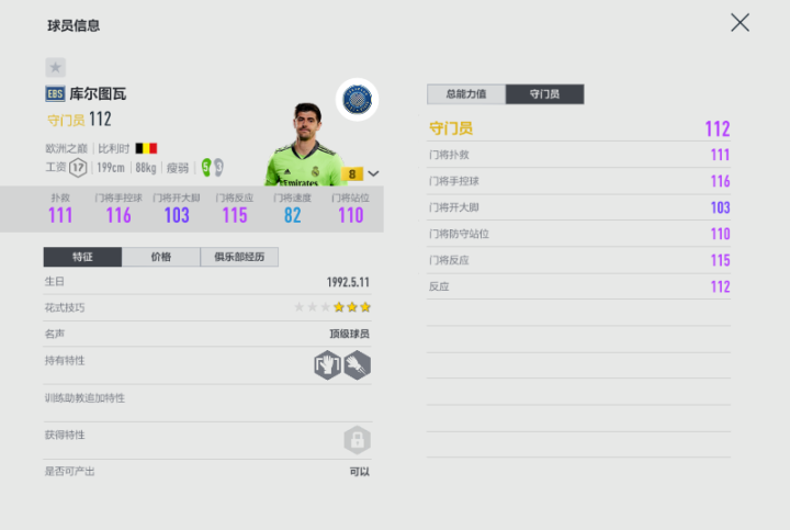 游戏中的库尔图瓦包括21TS、MC、MOG等多个赛季,不过为了考虑工资问题,MOG、BOE金卡或许是许多玩家的选择。而这张新推出的EBS赛季金卡能力值也同样出色,特别是门将手控球与门将反应两项数据上,都能达到125左右的加成数据,也就是说,结合接近2米模型的“裤袜”在摘角球以及对方射门的第一反应时是非常出色的,游戏中几乎达到最顶级。