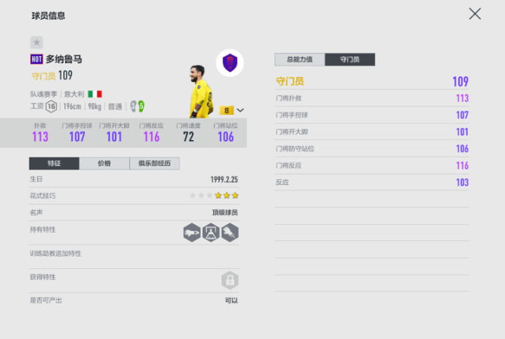 游戏中多纳鲁马的巅峰赛季卡是最新的21TS赛季,而BOE及HOT赛季是比较实惠的,也只需要占阵容的16点工资。相对来说,BOE在总评与防守站位上略胜一筹,HOT市场价格更低,两个赛季的特性是一样的,都有门将扑救、激进式角球防守和清道夫三个特性,没有门将1V1和大力手抛球也算是比较遗憾了。