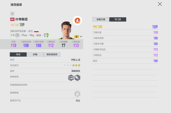 游戏中的BOE什琴斯尼金卡也是性价比很高的一位球员,门将防守站位和门将反应两项属性可以突破120,而除了开大脚之外,其他属性也都在118左右,还有冷静处理单刀球的特性,对于一名15工资的门将已经无法要求更多。