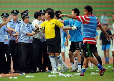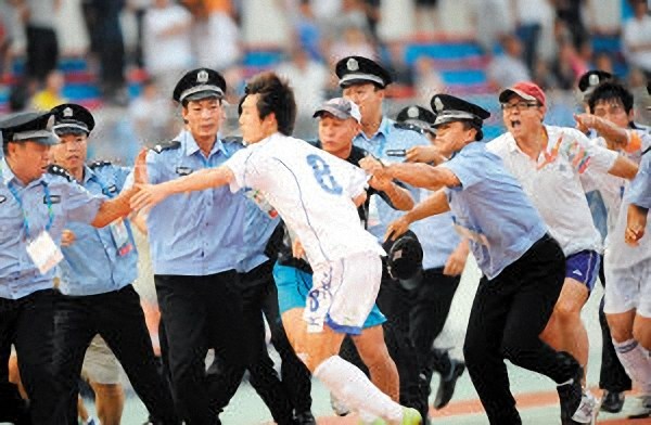结果在这场比赛中,发生了震惊中国足坛的“追打裁判”事件。当时,两支球队踢得非常激烈,双方动作都有些大。必须取胜的天津队更是拼劲十足,场上比分一度打成1比1平,之后当值主裁何志彪就成为了球场上的主角,他连续罚下天津队两名球员,使原本相对均衡的态势瞬间发生了逆转,北京队利用人数上的优势连续打入2球,最终天津队1-3失利。