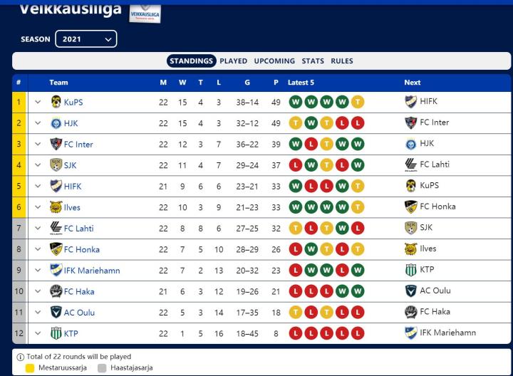 在刚刚结束的芬超第22轮比赛中,赫尔辛基HJK主场0-1不敌图尔库国际,HJK最近3轮仅拿下1分,将原有的较大领先优势全部挥霍,目前和古比斯同分,但净胜球少4个。