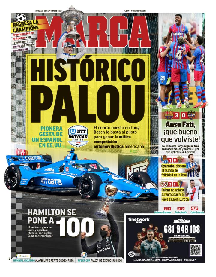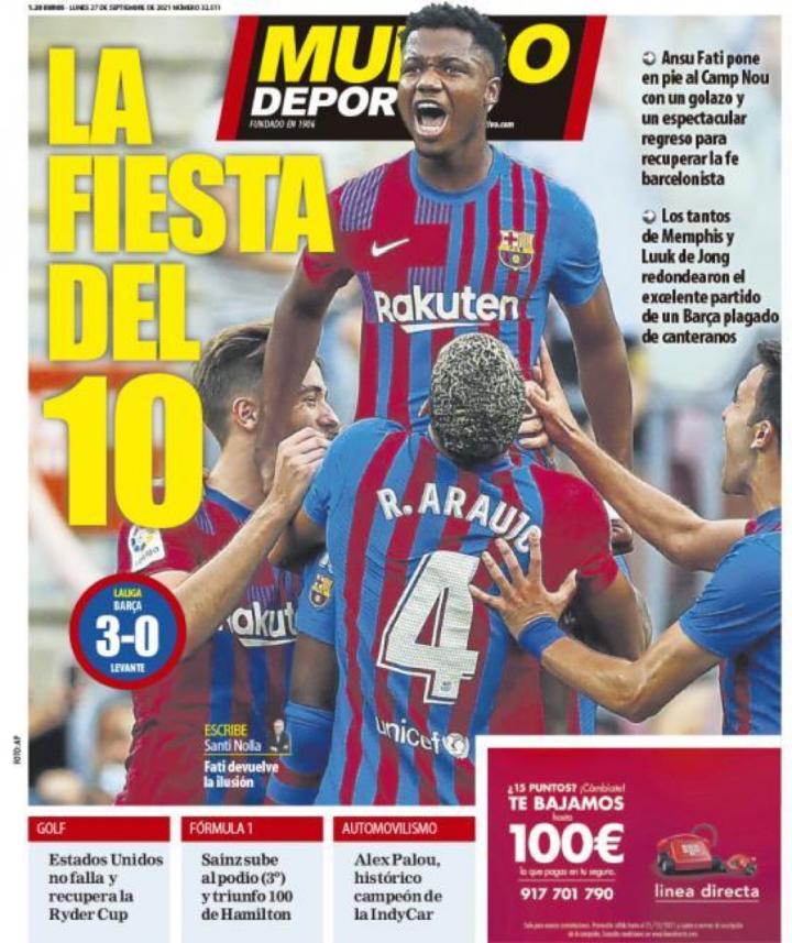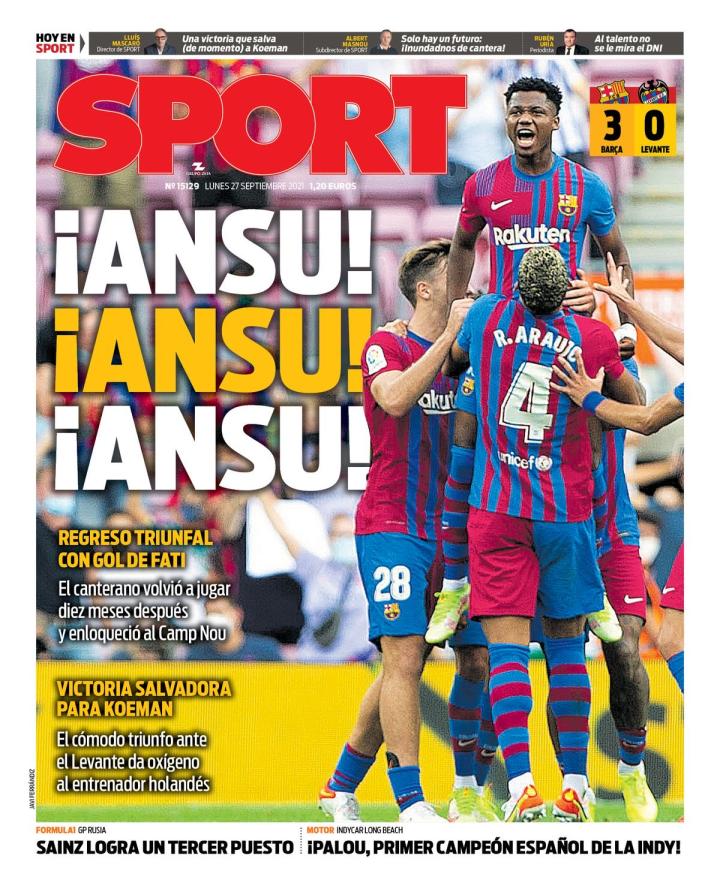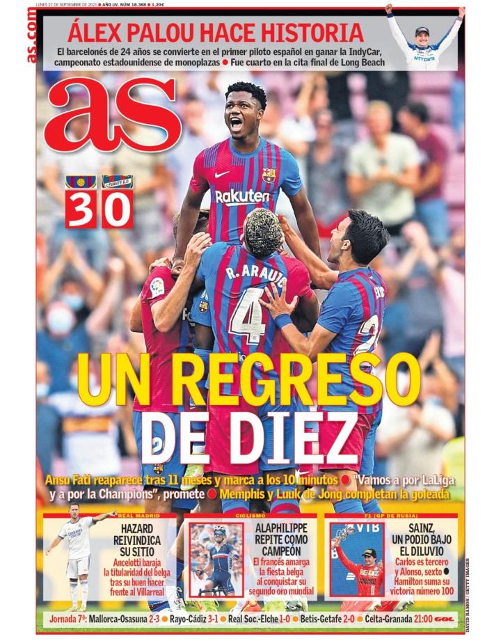 丨足球图片丨西班牙四大报纸今日头版 《世界体育报》:10号的节日 《每日体育报》:安苏!安苏!安苏! 《阿斯报》:10号的回归 《马卡报》:阿莱克斯-帕卢赢得印加赛车冠军;右上方小字“法蒂,你回来真好”