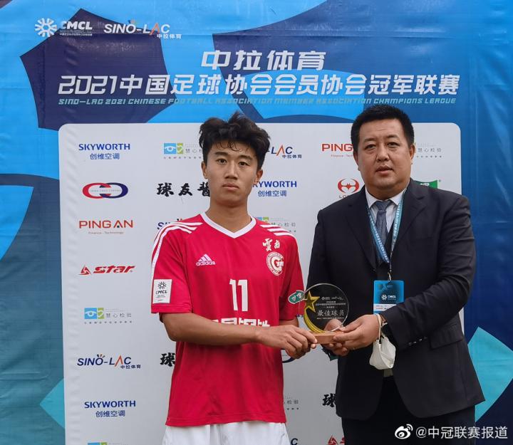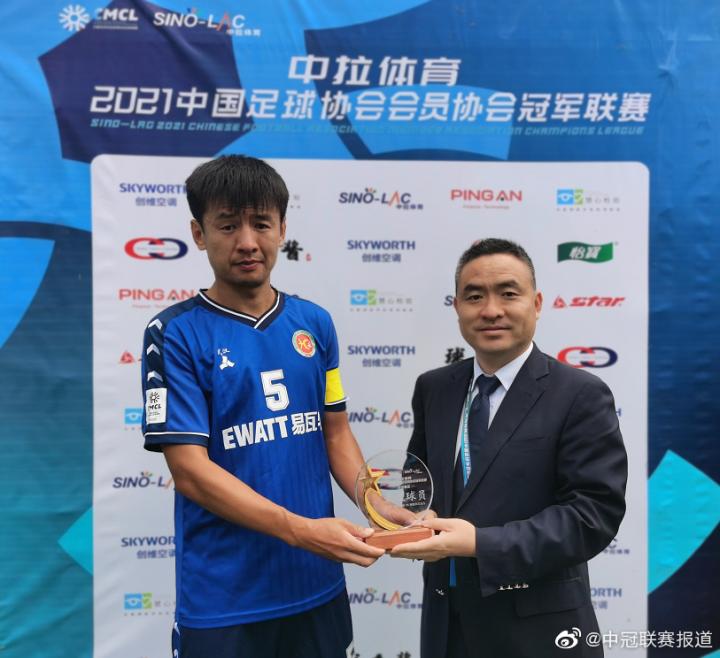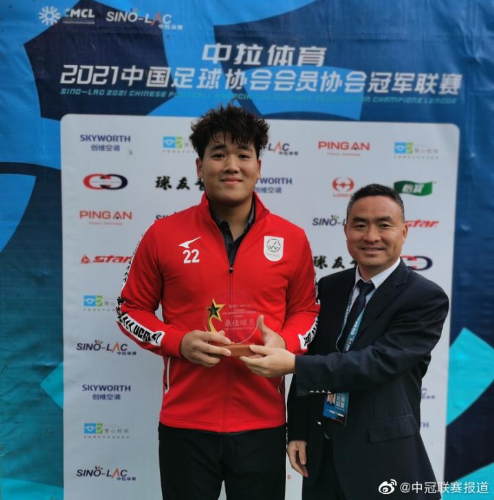 (湖北武体载铭的门将胡广垠80米开外大脚开球匪夷所思破门,收获本场比赛最佳球员。)