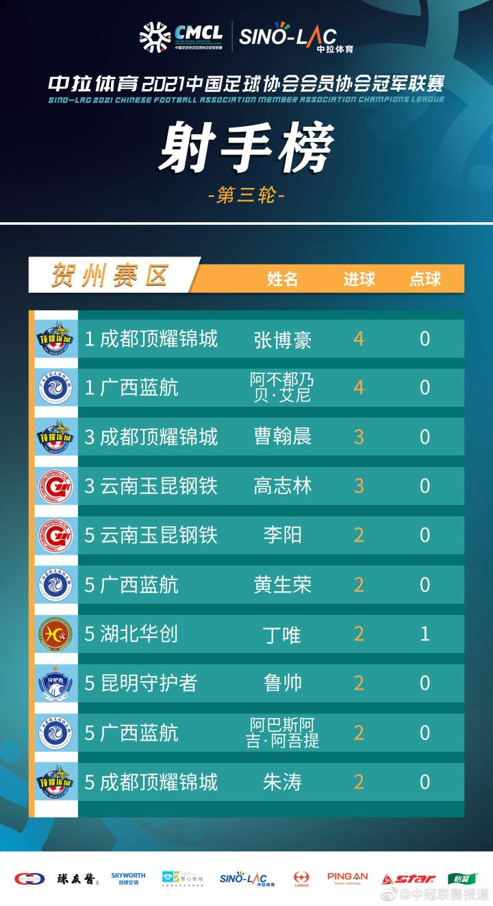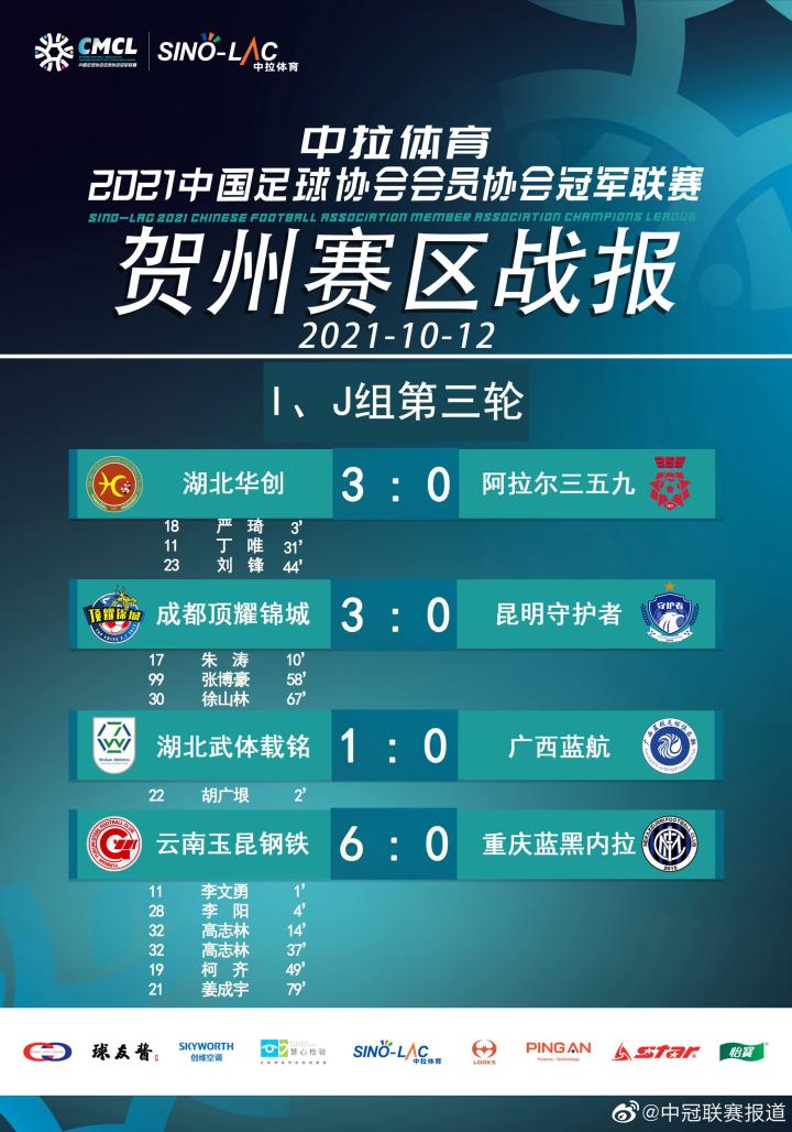 10月12日9:30,中冠联赛大区赛贺州赛I组第三轮,广西贺州姑婆山温泉足球小镇1号场,湖北华创对阵阿拉尔三五九。第3分钟,湖北华创18号严琦弧顶贴地远射破门,1-0,31分钟,湖北华创写意直塞,11号丁唯单刀推射破门,2-0;44分钟,湖北华创左路传中,23号刘锋头球破门。3-0。最终湖北华创以小组第二名出线。