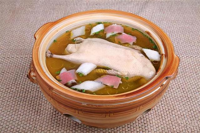 这“开水”不是我们平时烧开的水,而是精心配置的 鲜美汤汁:精选老母鸡、老母鸭、火腿蹄肉、排骨、干贝 等食材一起入沸锅煮,加入料酒、葱蒜等调味品熬煮 4 个 小时,再将鸡肉蓉加入汤中搅拌,然后倒入锅中吸附浮沫 和杂质,反复几次直到鸡汤变得如同开水一样清澈。