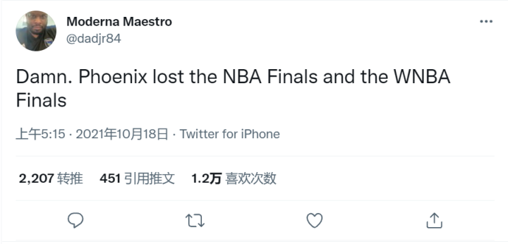 这也是继太阳在今年7月20日丢冠后,菲尼克斯球迷在3个月内第二次遭受打击。一名菲尼克斯当地球迷也更新推特,吐槽称:“真见鬼,菲尼克斯在今年同时输掉了NBA总决赛和WNBA总决赛。”美媒发文,标题也赫然写着“布克和陶乐西都未能将总冠军捧回菲尼克斯”。