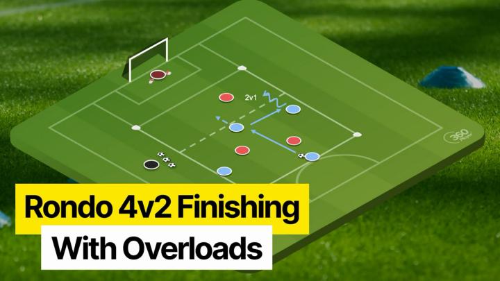 我们要学习的下一个练习,也是一个基于抢圈的练习,它也也是在运动中完成的练习,被称为压迫下4V2抢圈射门练习。