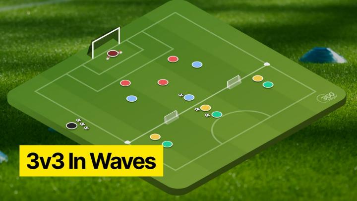 将球员分成三队,一队先防守,其他队每队一球做好准备,第一组先3v3进攻射门,一旦得分或者出界,一组出局,下一组开始进攻,原来的进攻方从进攻转换到防守。