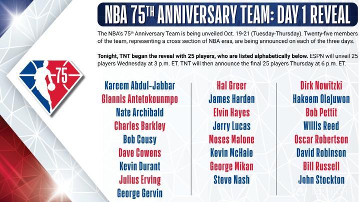 北京时间10月20日上午,NBA历史75大巨星名单陆续公布,今日公布了75大巨星首日的成员名单共计25人,杜兰特、哈登、安特托昆博、诺维茨基、纳什等球星入选。
