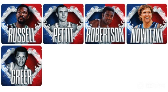 首日名单第一组:比尔-拉塞尔、鲍勃-佩蒂特、奥斯卡-罗伯特森、德克-诺维茨基、哈尔-格里尔