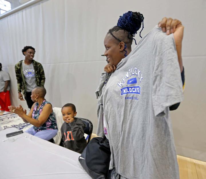 当时,奥斯敏陪儿子坐在镜头前,只见特伦斯站了起来,拉开绿色迷彩夹克的拉链,露出里面所穿的,胸前印有蓝色“KENTUCKY WILDCATS”字样的灰色T恤。他跳级到2020届高中生,以便当年秋天就可来到肯塔基。