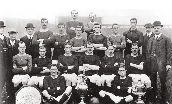 1905/06赛季,曼联时隔12年重回英格兰顶级联赛,并在那一年成功杀入足总杯八强。升级之后,球队又趁乱从当时深陷丑闻的曼城挖来强援,一时间势如破竹,在1907/08赛季连夺队史首个联赛冠军与社区盾冠军,并在随后的1909年斩获足总杯冠军。