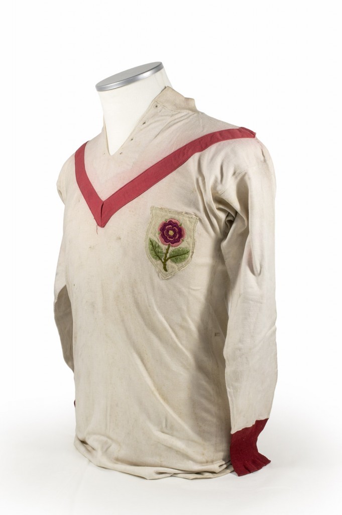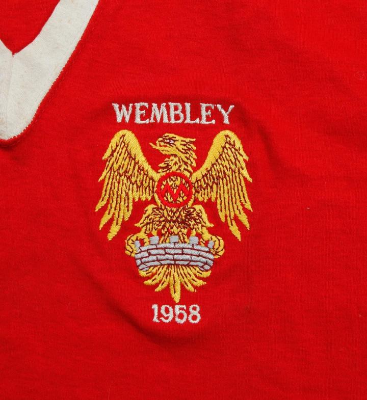 而那场决赛中,曼联好巧不巧地与同样钟爱红色的布里斯托尔城撞了衫,一个名叫乔治-罗比的喜剧演员在听闻此事后来了灵感,他为曼联专门设计了一套“决赛限定版”球衣:主体为白色,胸前一道红色V形条纹,一朵象征兰开斯特家族的红色玫瑰纹章附着在左胸上——要知道在此之前,曼联是从不身着印有队徽的球衣出场的。