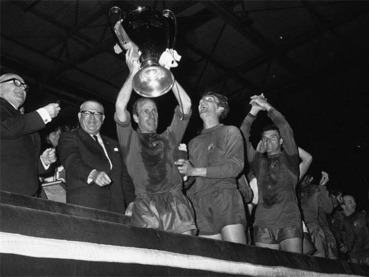 查尔顿高举欧冠奖杯,当时他们穿着深蓝色的客场球衣,印的还是以城市纹章为原型的老队徽