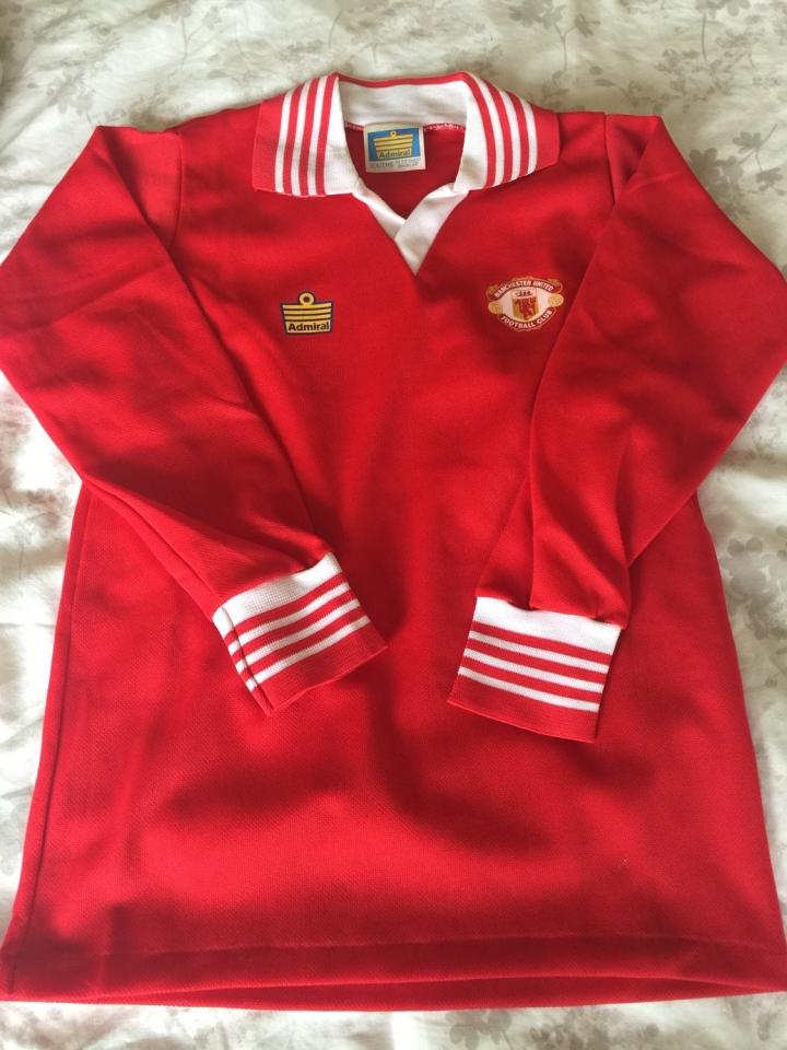 70年代后期的曼联主场球衣,加上了队徽和赞助商的logo