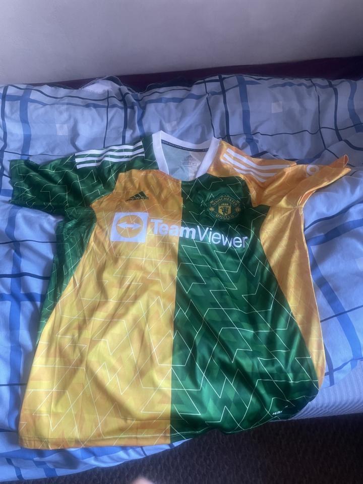 而在刚刚过去的2021年,另一件整活版球衣一度在网络中传开,又是金绿色。几乎可以断定,图片中这件由球迷自行定制的所谓“曼联22/23赛季客场球衣”不可能是真的,它的创作者大概率是文章开头那群穿戴金绿色的“老特拉福德闹事者”。