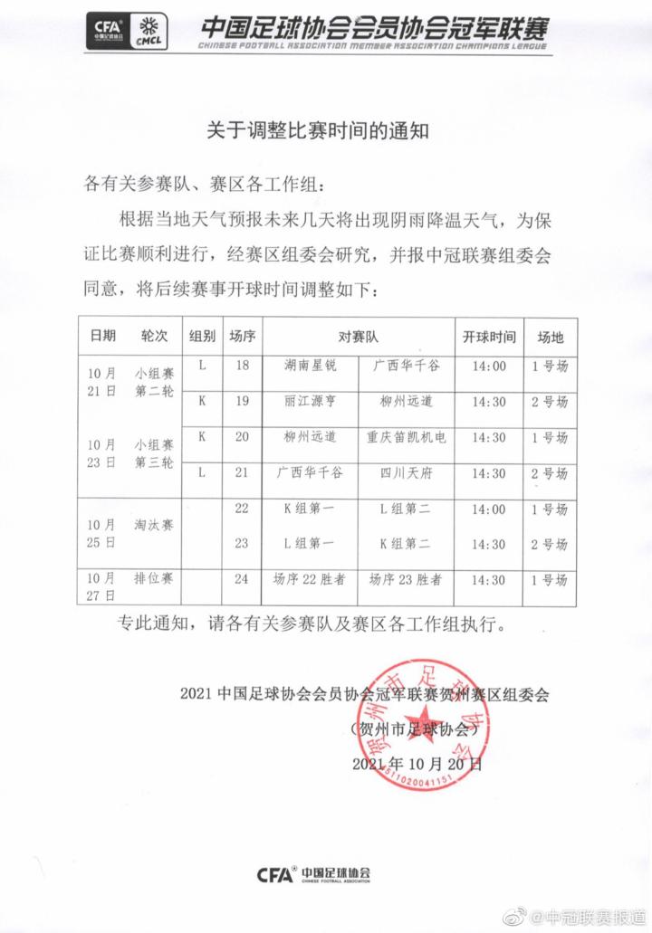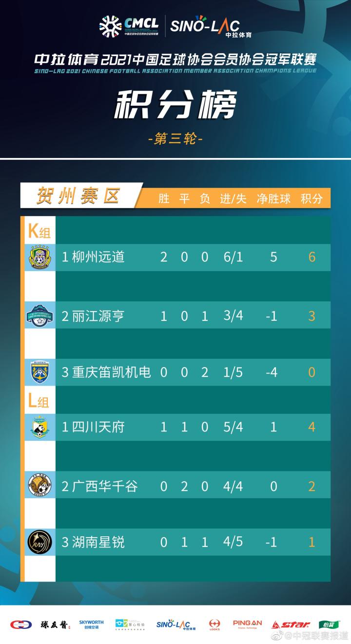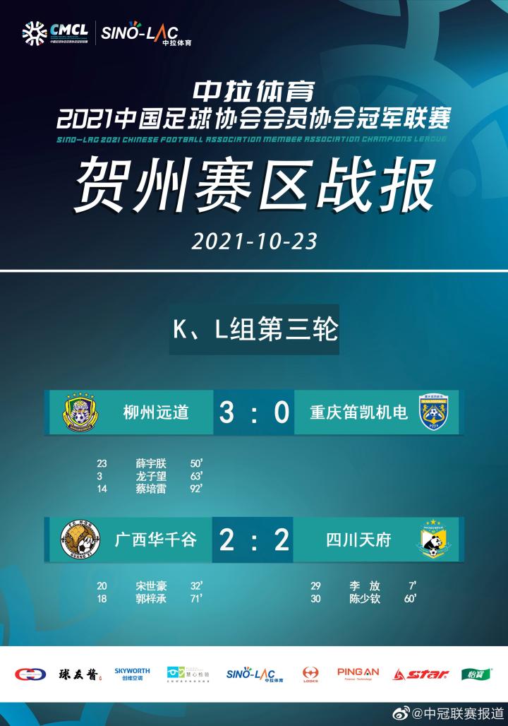 耀武酒肆工作室10月23日,中拉体育2021中国足球协会会员协会冠军联赛(中冠联赛)大区赛贺州赛区第二阶段比赛继续在广西贺州足球小镇·星耀五洲南方赛事中心进行,K、L组小组收官战,两支广西球队广西华千谷、柳州远道携手出线,交叉淘汰赛将上演广西德比。