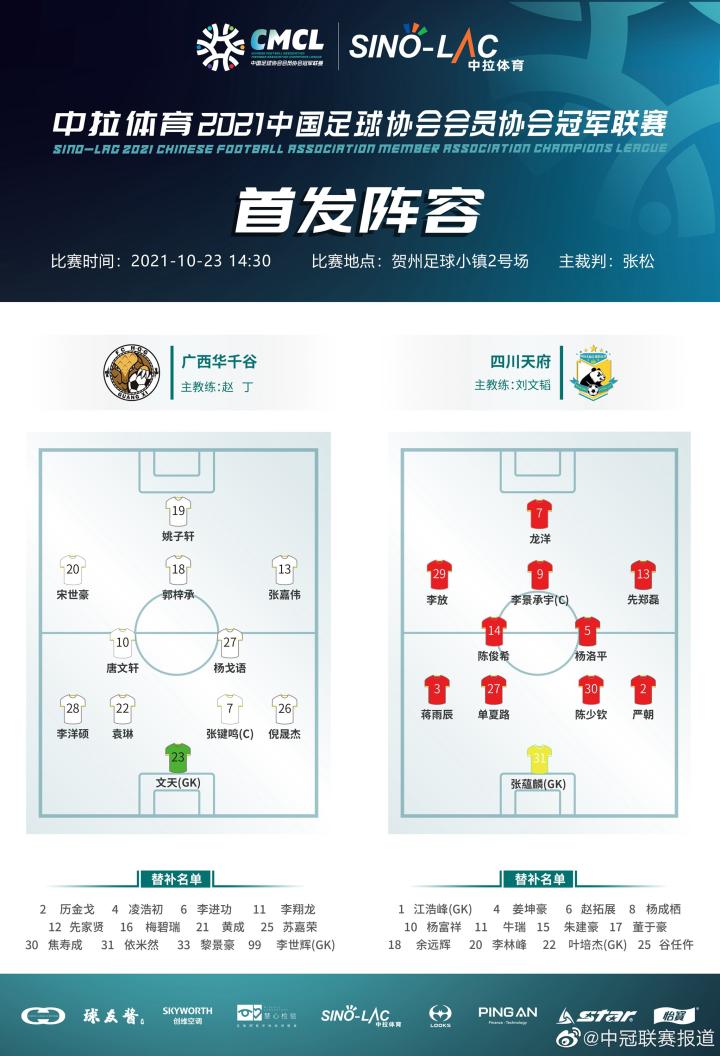广西华千谷新任主帅赵丁继续排出了451的阵型,19号姚子轩单箭头,18号郭梓承打前腰,20号宋世豪打左边、13号张嘉伟打右边,10号唐文轩、27号杨戈宇打双后腰,队长张健鸣、和老将袁琳领衔4人后防线,门将文天,广西华千谷首发调换两人,44岁的前中超冠军队长袁琳首发登场引人瞩目。四川天府主帅刘文韬也排出451阵型,龙洋单箭头,队长李景承宇打前腰,李放打左边、先郑磊打右边,陈俊熙、杨洛平打双后腰,老将陈少钦、单夏路领衔4人后防线,门将张蕴麟,四川天府首发3名有中超中甲经验的老将压阵。