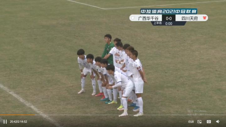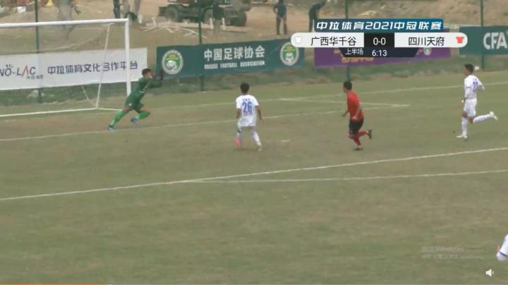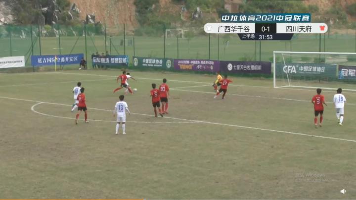 因为是事关出线的关键比赛,双方开场打得都比较谨慎,广西华千谷打得更为主动一些。第6分钟,广西华千谷后卫传球失误,四川天府29号,前中超球员李放机敏断下皮球,面对门将单刀破门,1-0,四川天府先声夺人;失球之后的华千谷放平心态,耐心寻找战机,第31分钟,华千谷18号郭梓承前场铲断、13号张嘉伟斜传左路空挡,20号宋世豪突入禁区面对门将冷静推射破门,1-1,广西华千谷扳平比分,串联进球的三名球员都是不到18岁的03年小将。
