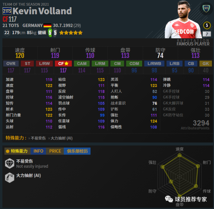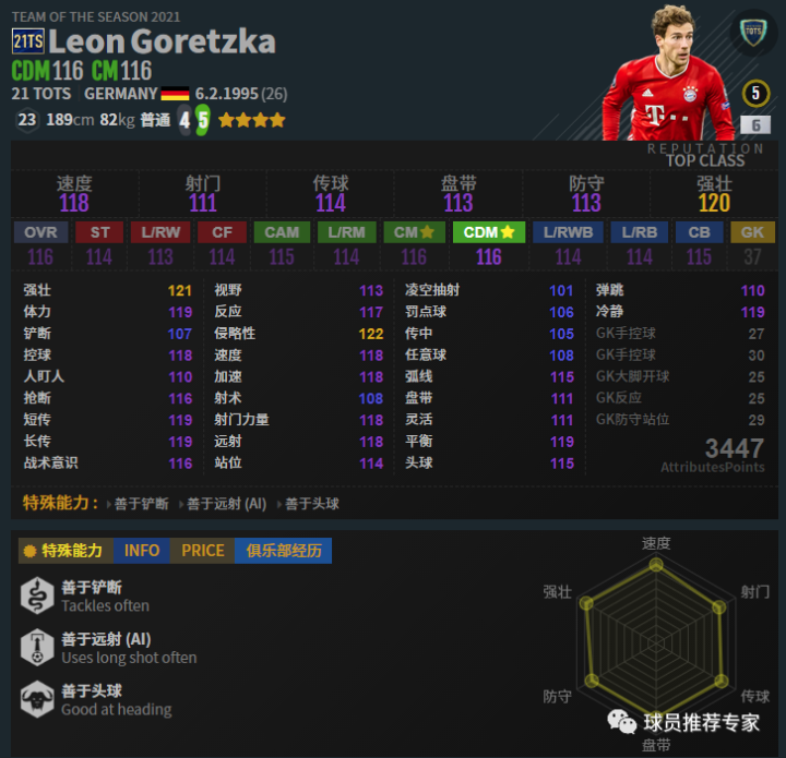 戈雷茨卡基本属于红级的天花板级别的中场了,各方面都非常完美。这次的21TS戈雷茨卡体重增到了82kg,比之前的76kg可谓增强不少。有体重保障,身体对抗也有了保障。难能可贵的是戈雷茨卡灵活还不低,手感还不错,速度还很快,进攻防守都是顶级,非常接近紫级的一名后腰/中场。赛季选择方面比较推荐21TS,能选21TS尽量选21TS吧,确实比UP和20U更好。