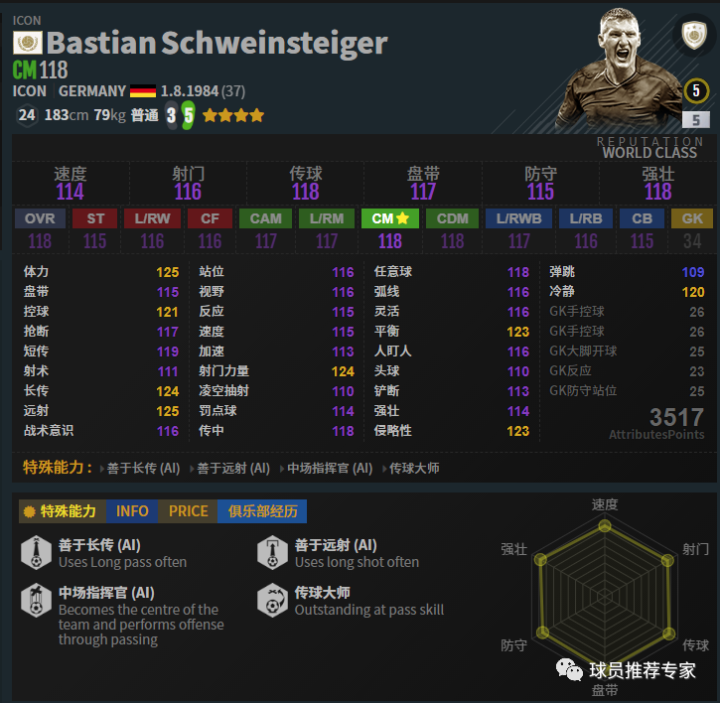 “小猪”施魏因斯泰格基本是属于完美的,只有一个毛病就是逆足。3逆足确实让人无语,不过小猪这张卡本身的强度是非常高的。各方面都非常出色,无论是控球、传球还是远射以及防守,都非常不错。但是给个3逆足是真的烦。赛季选择方面ICON和EBS都可以用。
