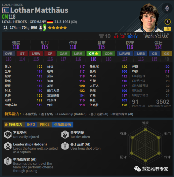 马特乌斯数据方面基本没毛病,无论是进攻端还是防守端都基本已经做到极致了,游戏里唯一吃亏的就只有模型了,174,70的模型确实吃大亏,但是马特乌斯依然是非常优秀的一名中场。赛季选择方面LH、EBS和MC都是不错的选择,HOT如果有金卡也是可以的。