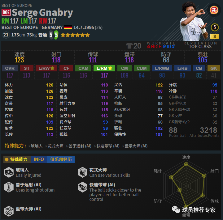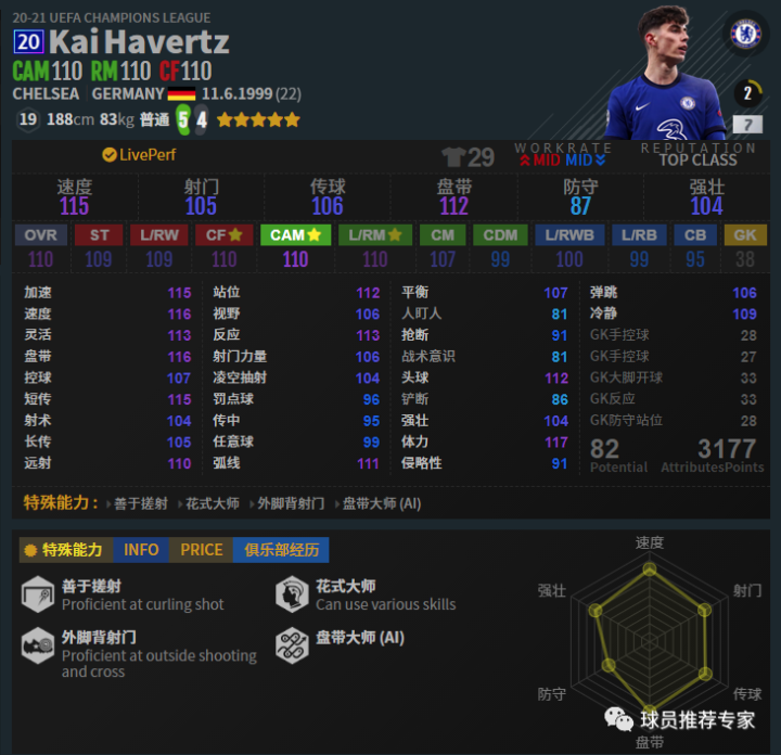 哈弗茨拥有不错的模型且速度很快,逆足也达到了4,还是不错的。射门方面也是不错的,传球分球能力都很出色,盘带也不错,手感可以很灵活。前腰和影锋位置他都能胜任。赛季选择方面20U要好于已绝版的20TS。