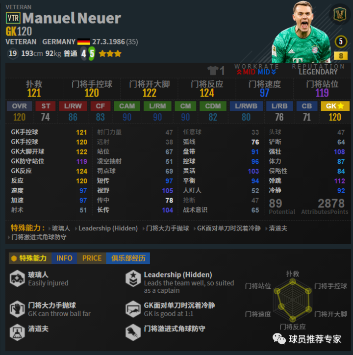 诺伊尔是顶级门神。193的身高不算特别高但是也绝对不矮,而且诺伊尔能力全面,扑救和反应都非常惊人,隐藏也堪称完美,1V1和大力手抛球都是非常好用的。而且诺伊尔活动范围很广,不仅仅是一名门将,完全就是一名“门卫”!面对单刀诺伊尔是真的无解,这诺伊尔绝对是可以让无数前锋望而生畏的。单刀遇到诺伊尔就犹如一座大山压在前面,不可逾越!