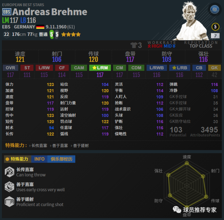 布雷默是非常推荐的一名边后卫,实战效果远大于数据显示,虽然他的数据也不赖。双5脚配合上优秀的出传中能力和超强的远射能力,让他在进攻端非常有威胁。防守方面也相当不错,模型也还不错,身高虽然不算高但是体重有77kg,一般的边锋还真不能在身体对抗上在布雷默身上占到什么便宜。而且布雷默AI很不错,感觉他抢断卡位很聪明,再加上还不错的身体轻松能将球抢下把对方卡在身后。赛季选择方面EBS和LH都是不错的选择,HOT如果高强也可以用。