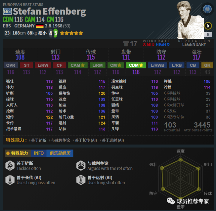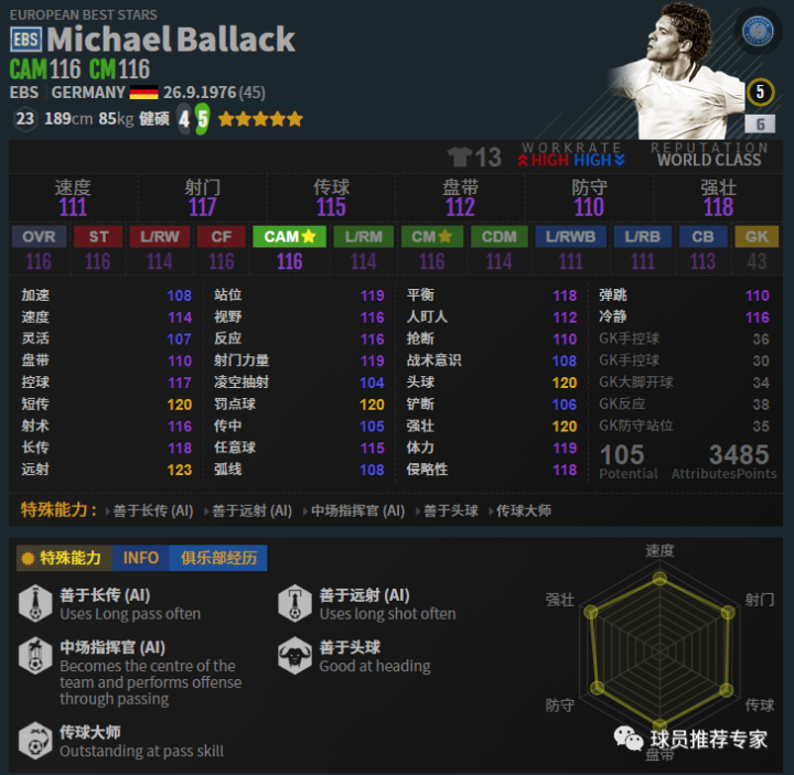 巴拉克可以说是绝对的神兽级别的中场,妥妥的紫级神将。赛季选择方面无论是MC还是EBS都是不错的选择,不过价格都非常昂贵,或许好的东西唯一的缺点就是贵了吧。巴拉克是真的不能和其他的球员去比数据的,哪怕是MC银卡,108的数据,也比很多112、113的球员好用多了。