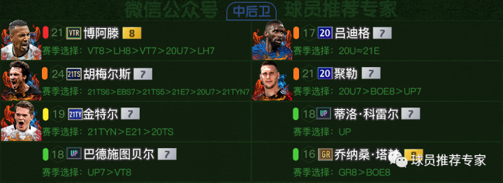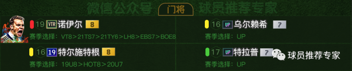 门将方面毫无疑问诺伊尔肯定是首选,乌尔赖希、特尔施特根和特拉普作为替补选择。诺伊尔多个赛季都可以用,顺位参考图中,然后根据自己的经济情况来选择哪个赛季、几强。