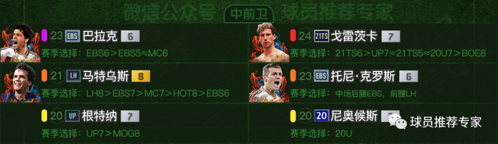 中前卫方面巴拉克和戈雷茨卡可谓变态。巴拉克绝对是神兽级别的顶级中场,戈雷茨卡也是出于红级顶端的超强中场。有这两大将坐镇,中场无忧亦。马特乌斯模型比较吃亏,中场和后腰都能胜任。托尼·克罗斯中场和后腰位置比较推荐EBS,因为防守能力较强,如果只是纯组织中场那在游戏里表现是比较一般的,EBS防守加强很多打后腰和中场位置都是比较不错的,LH赛季则很适合去打前腰。根特纳和尼奥候斯比较一般可作为替补选择。