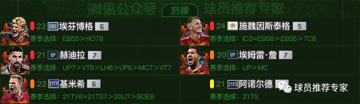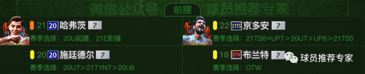 前腰方面哈弗茨是最优选,当然如果托尼·克罗斯用LH赛季的来打前腰也是非常棒的选择,也是可以达到橙级推荐的。其次京多安、施廷德尔和布兰特可作为替补选择。