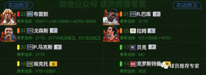 边后卫方面布雷默、巴库、戈森斯和拉姆是比较推荐的。其余的马克斯、贝克、埃克托和克罗斯特曼可作为替补选择。