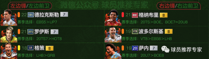 左边锋德拉克斯勒和罗伊斯是比较不错的选择,德拉克斯勒建议用EBS赛季,因为EBS5卡就已经比UP7卡强度更高了。罗伊20TS是最好的赛季,但是已经绝版了比较难搞到,HOT金卡也是不错的选择。格策可作为第三选择,格策前腰、边锋、影锋都能胜任。右边格纳布里是最优选,波多尔斯基在德国套里是可以作为边锋备选的,因为德国边锋确实少了点,萨内也是不错的选择。