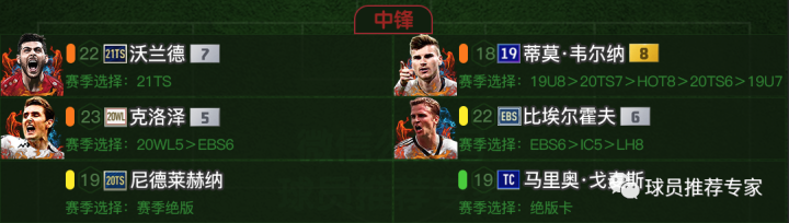 中锋方面沃兰德和维尔纳是最优先,目前直塞版本速度快的中锋是比较吃香的。沃兰德身强体壮,速度还快,并且还是双5脚,左右开弓非常舒服。维尔纳速度极快,反击利器。克洛泽WL赛季的模型其实还可以,184cm的身高,84kg的体重让其具备一定的抗人能力,瘦弱体型让克洛泽会更灵活一些,实际用起来没有传的那么不堪。比埃尔霍夫不太适合目前的版本,头球版本崛起了那“大比”就有用武之地了。尼德莱赫纳和马里奥·戈麦斯都是绝版卡,难以搞到。