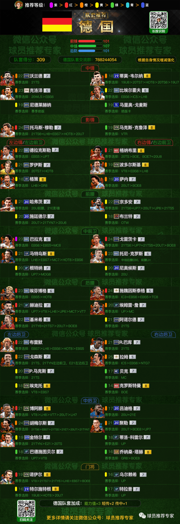 我们可以设定一套规则来反应队套强度。设定紫色12分,红色10分,橙色8.5分(最终结果四舍五入),黄色7分,绿色6分,青色3分,蓝色1分,统计36人大名单的球员的得分(前锋方面:中锋+影锋6名,边锋6名;中场方面:前腰、中场、后腰各4名;后防方面:中卫6名,边后卫4名,门将2名)。根据规则得出德国套的36人总得分是:309。