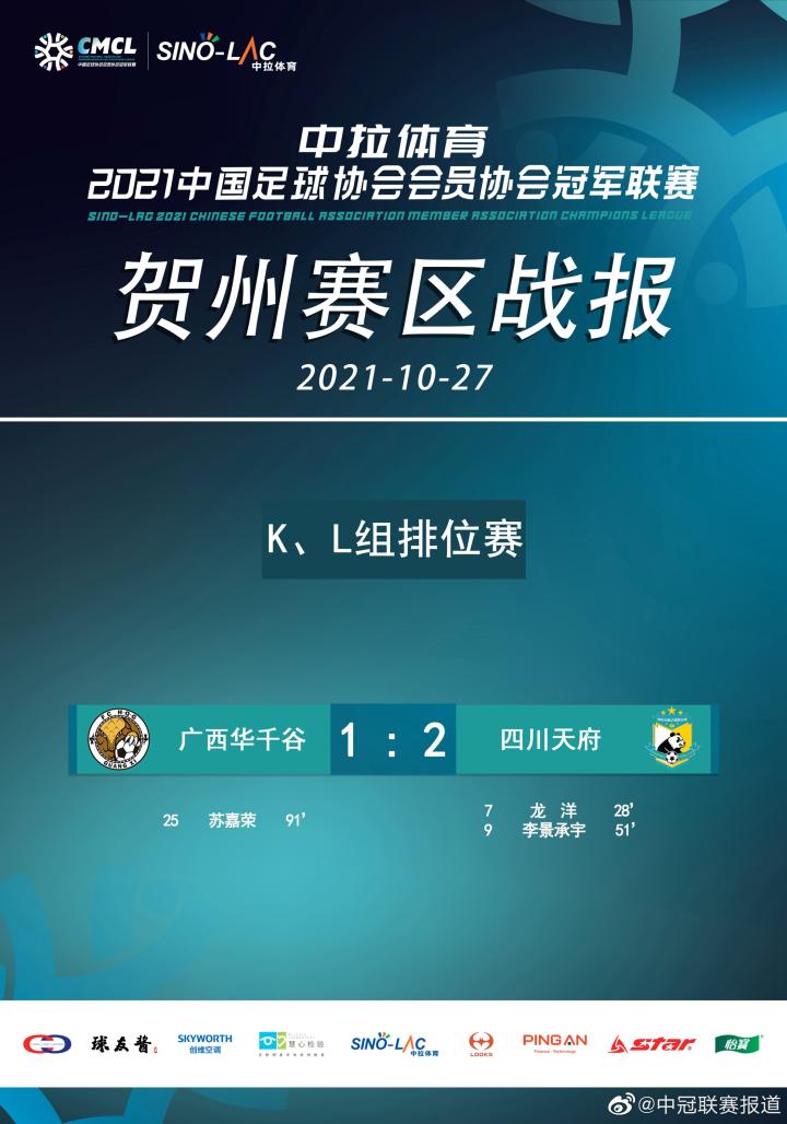 耀武酒肆工作室10月27日,中拉体育2021中国足球协会会员协会冠军联赛(中冠联赛)大区赛贺州赛区第二阶段比赛在广西贺州足球小镇·星耀五洲南方赛事圆满收官,K、L组交叉排位赛,广西华千谷虽然不敌四川天府,但依然和对手携手闯入中冠总决赛16强,创造了贺州足球的历史,贺州赛区也圆满完成东道主的使命。
