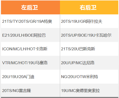 说明:边后卫的选择更多需要根据工资空间定,如果中前场使用了多个高工资卡,那么边后卫就需要用19A特奥这种省工资利器;如果追求各个位置的平衡,那么LH阿拉巴+BOE卡瓦哈尔的组合比较推荐;双五脚的20U门迪则可以作为重要替补,随着补位两边。