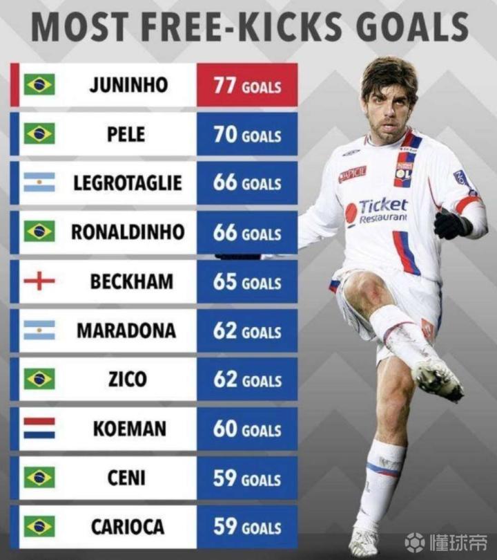 足坛历史任意球射手榜前10:任意球大师辈出的年代...