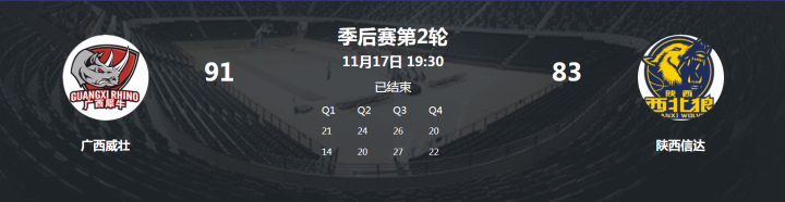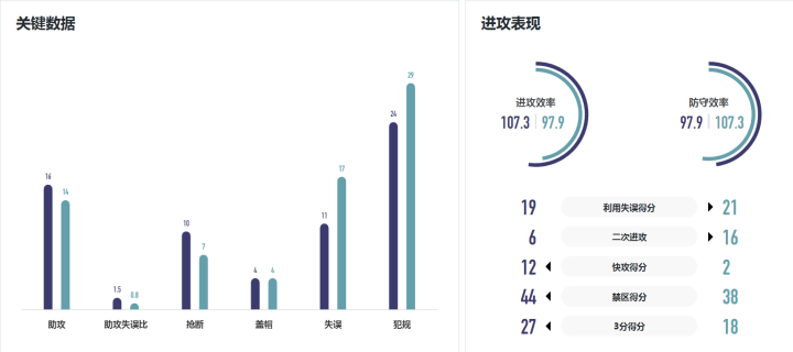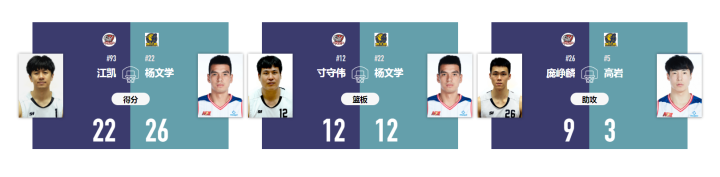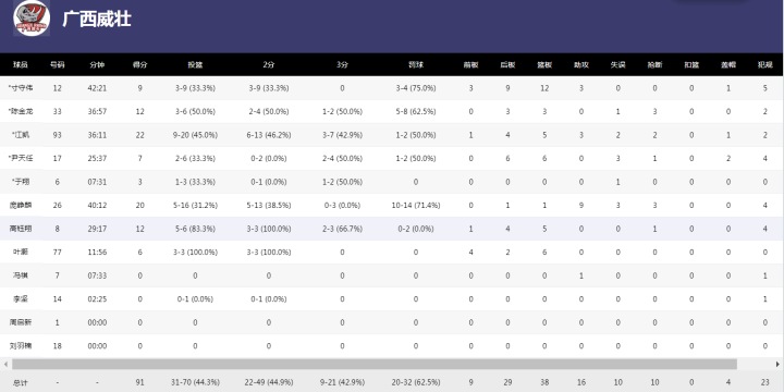 技术统计方面,广西威壮8人得分4人上双,江凯拿下全队最高的22分5篮板、广西仔庞峥麟20分9助攻、陈金龙12分3篮板、高钰翔12分5篮板、寸守伟9分12篮板、尹天任7分6篮板,广西仔叶灏拿下6分6篮板,陕西信达方面,杨文学26分12篮板、董健22分3篮板3助攻、宋建骅12分6篮板、克里木8分11篮板。两队数据对比方面,广西威壮70投31中命中率44%领先2%,3分球广西威壮21投9中得27分命中率43%领先对手9分高21%,禁区内得分44分领先6分,快攻得分12分领先10分,广西威壮强硬的防守、快速进攻和内外线的稳定输出决定了比赛的胜负。