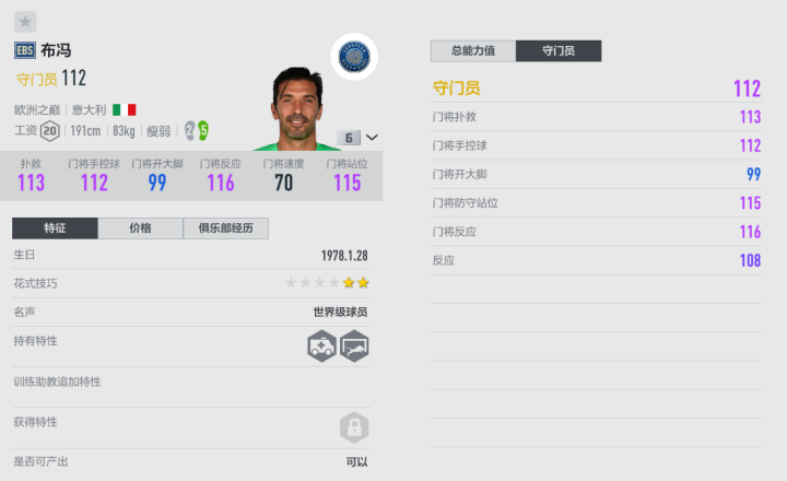 “小将”布冯是足球史上伟大的门将之一,他的职业生涯非常成功,也经历了不同的时代,比赛经验十分丰富。从舒梅切尔到卡恩,从卡西利亚斯到诺伊尔,布冯一直在和一批又一批的顶级门将竞争。游戏里布冯最好用的赛季当属EBS,这里为大家重点介绍。